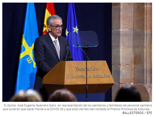 En representación de todo el colectivo sanitario el doctor Jose Eugenio Guerrero Sanz expuso un discurso emotivo y motivador, aludiendo a la solidaridad y a los valores que impulsan a este colectivo y que le han sostenido, y le sostienen en su lucha contra la actual pandemia de la Covid-19. «No fuimos héroes. O quizá lo fuimos todos. Porque frente a una pandemia que nos obligaba al distanciamiento, supimos romper la barrera y hallar un punto de encuentro… … a buscar en la mirada de los otros la fuerza para seguir adelante, sabiendo que no estábamos solos», para terminar con un sentido recuerdo a todos los sanitarios fallecidos.